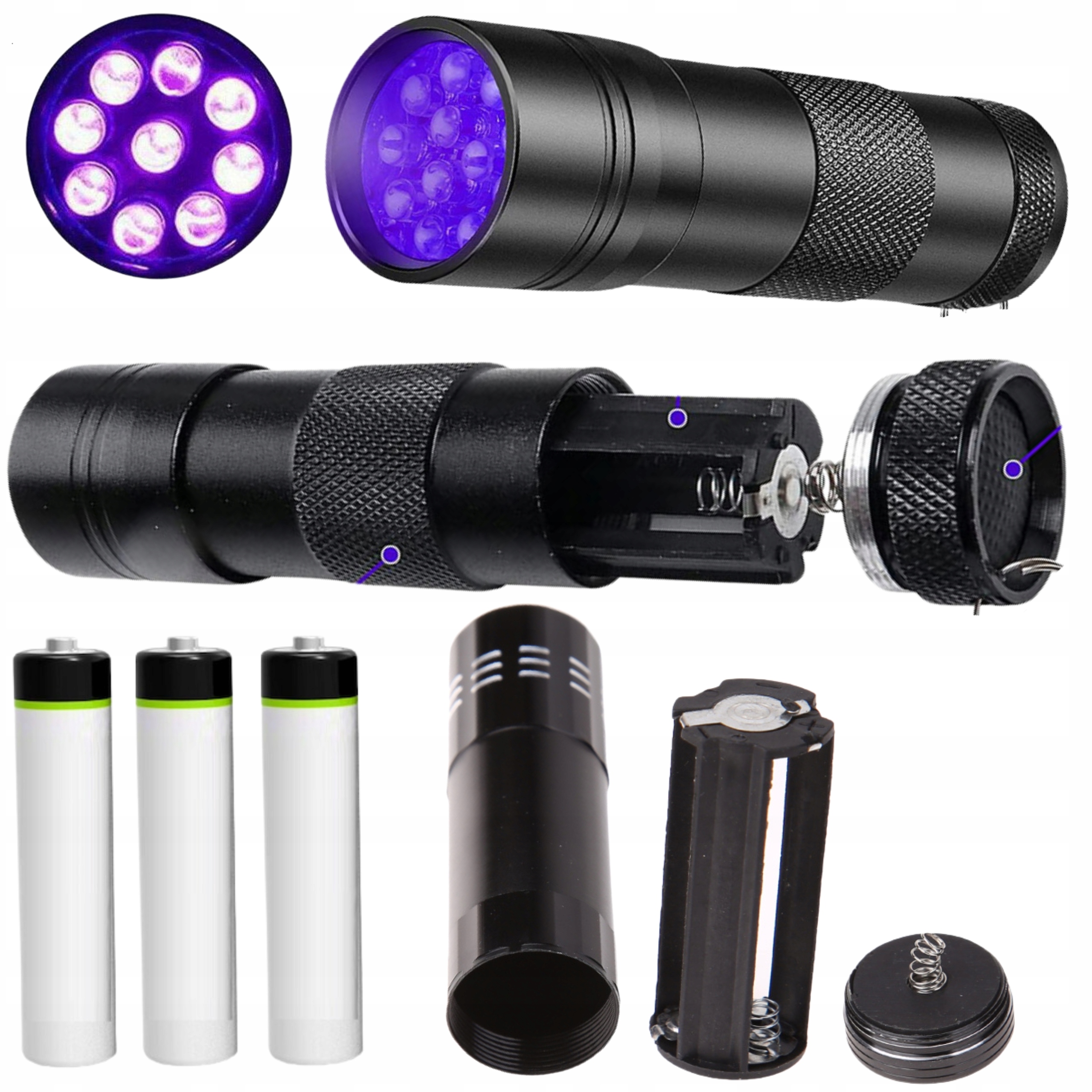 MOCNA LATARKA UV DO SZUKANIA BURSZTYNU 9 LED 395nm ULTRAFIOLET +Baterie AAA