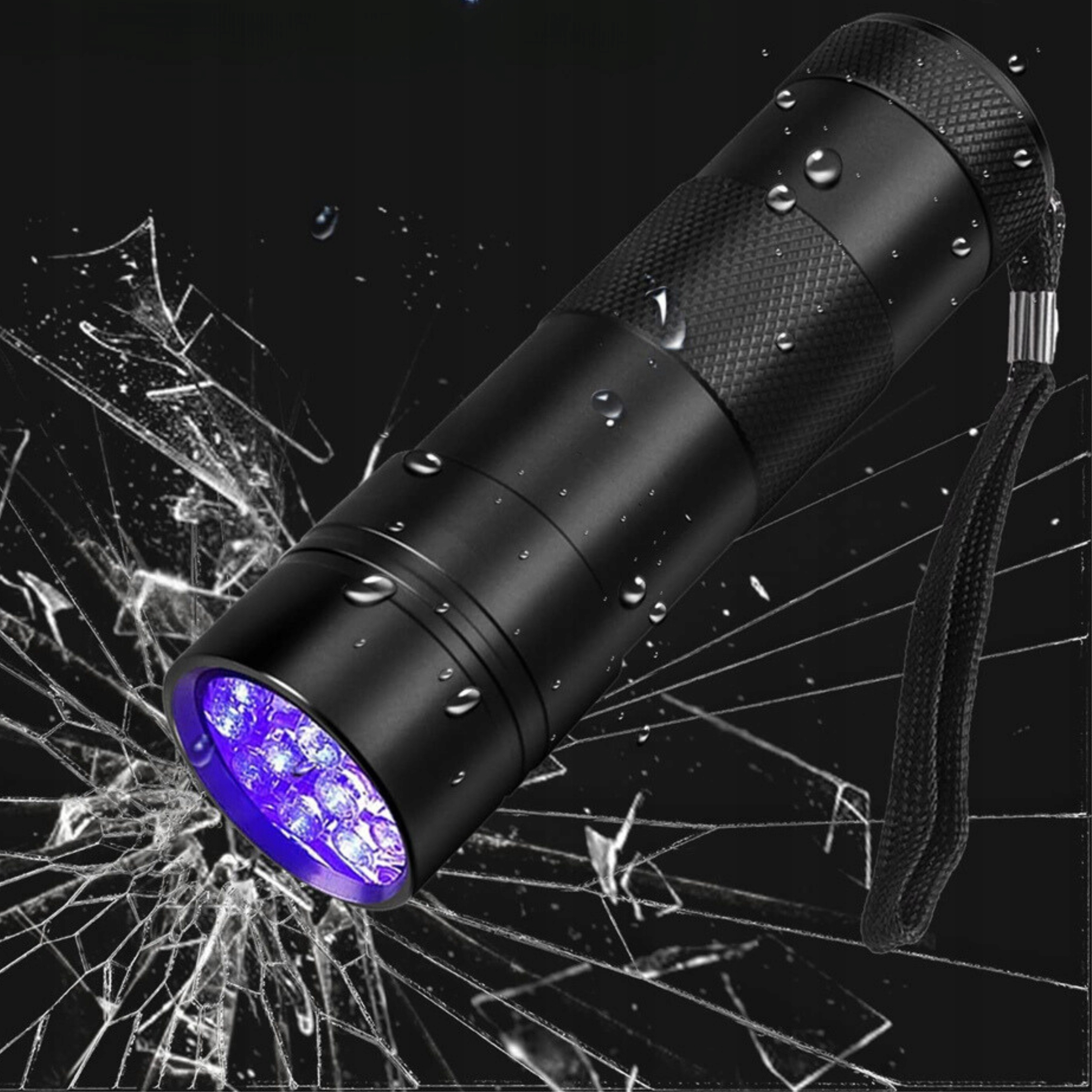 Kompaktowa i wielofunkcyjna latarka wyposażona w 9 diod LED UV – idealna do wykrywania środków fluorescencyjnych.